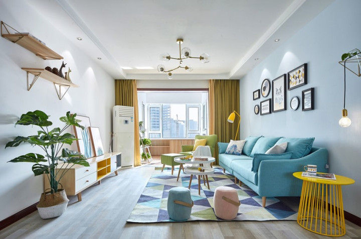 背景墙还挂上了艺术照作为装饰背景,简单又好看,整个客厅色彩上的搭配真的让人很喜欢,活力满满。